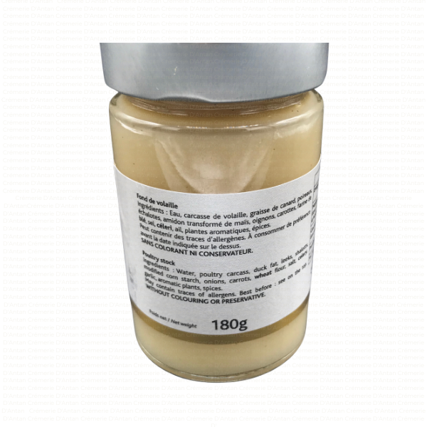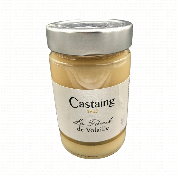 Fond de volaille élaboré par la maison Castaing à St-Sever, sans colorant ni conservateurs, avec de la graisse de canard, poireaux, échalotes, oignons, carottes, céleri, ail, plantes aromatiques et épices.