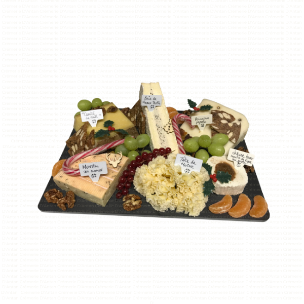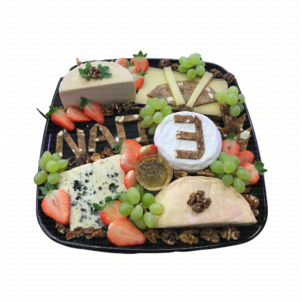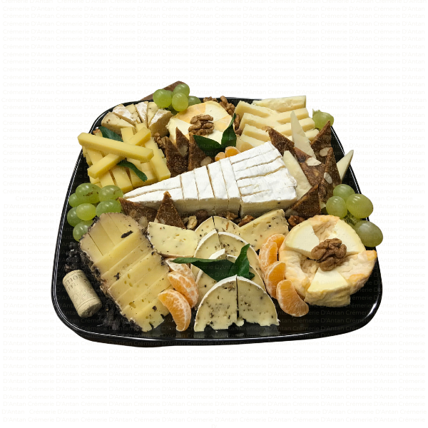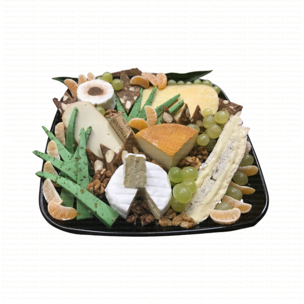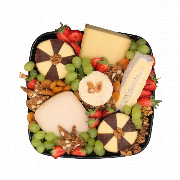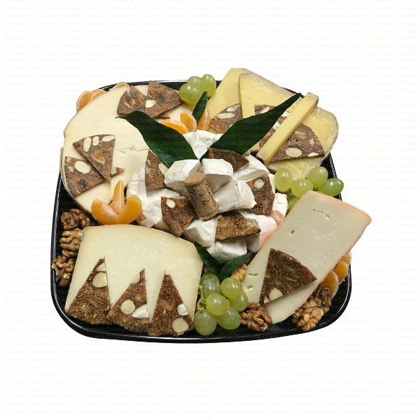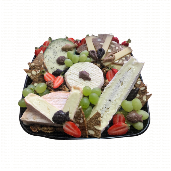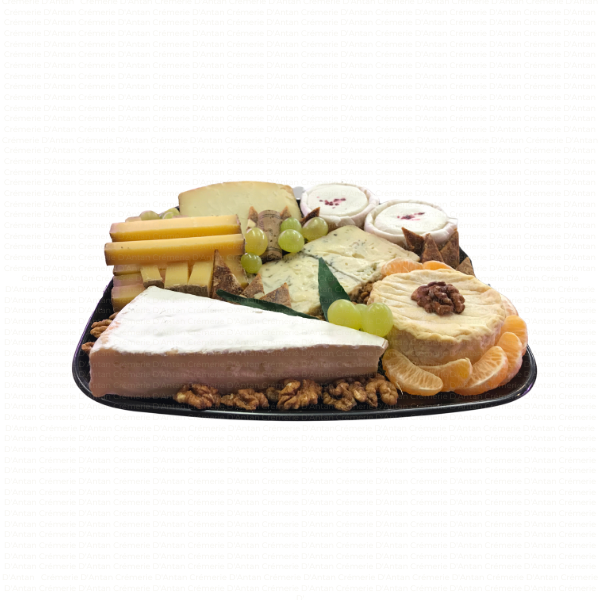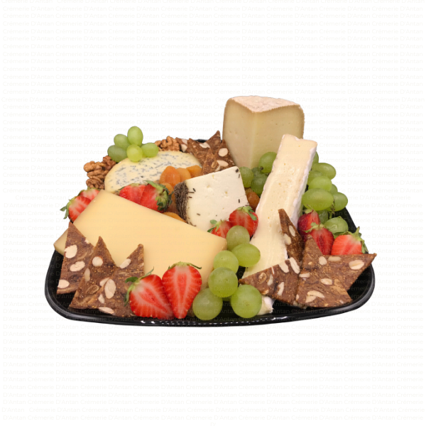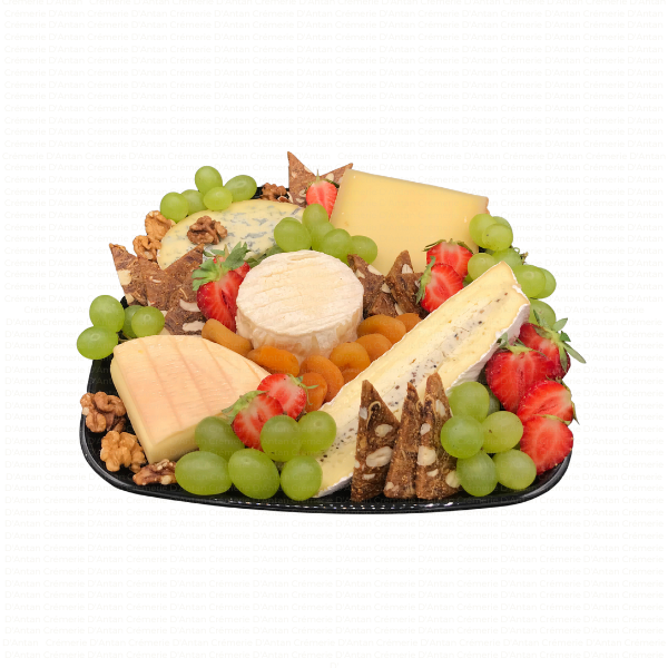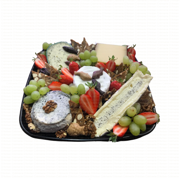 Plateau type fin de repas, avec un assortiment de minimum 5 sortes de fromages affinés, accompagnés de fruits secs, fruits frais, ou gelées et confitures selon saison.